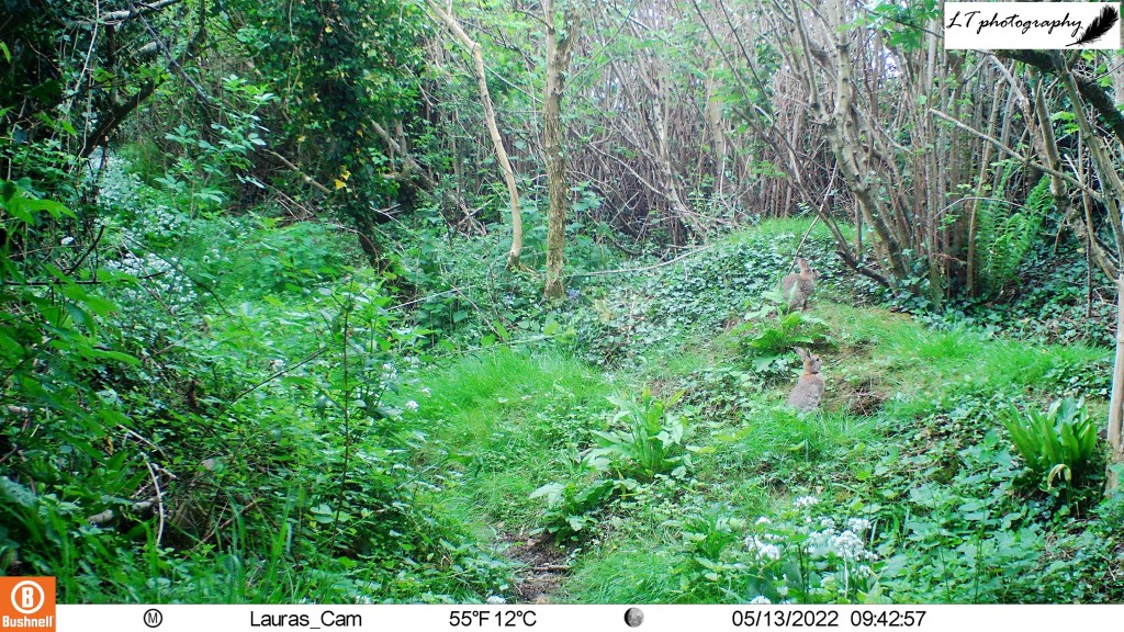 Along with birds, lots of different mammal species also make use of Badger Alley. This year my camera trap caught sight of two smaller mammal species: grey squirrels and rabbits. Non-native grey squirrels were only seen on my camera 3 times, but made their presence known rushing around in a hurry. The rabbits were a more common sight, being seen 23 days out of the 67 recorded. These rabbits populate both Badger Alley setts and are increasing steadily in numbers. My camera watched on as rabbits fought with each other, mixed with other species, and raised their babies. Though a less common sight for many people now, our successful rabbit populations have become an important food source for other species in our area.