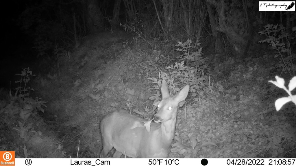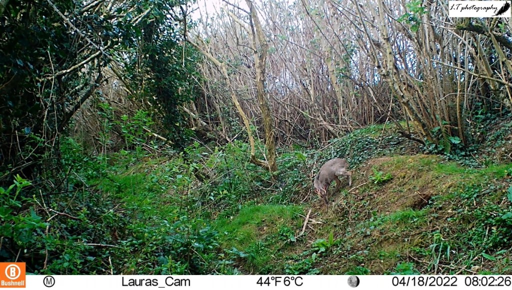 Deer populations have been experiencing increases in the countryside over the last few years, and Badger Alley has become a popular throughway as a result. This year my camera trap recorded roe deer sightings on 22 days of 67, with different variations of individuals, from lone males and females to males following females around. Some of the highlights include a deer being particularly interested in my camera, a female feeding alone, and the unusual sight of a female with a missing back leg. An individual that stole the show though, was not a roe deer, but a muntjac. I have never seen a muntjac on our land before, so my camera caught my very first sighting for me!