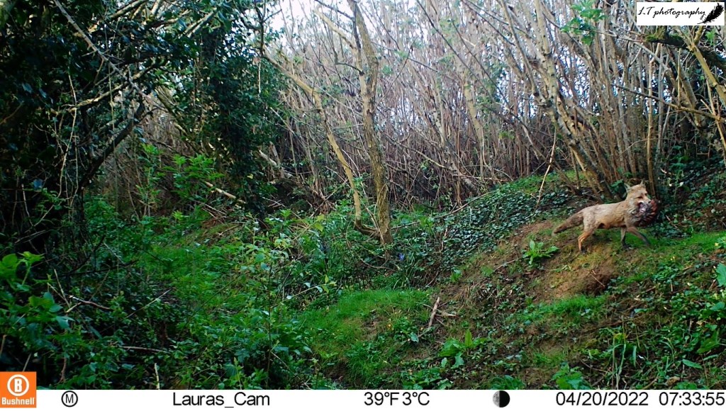 This year’s most observed species in Badger Alley was by far the fox, being recorded 37 days out of 67. During this time it was really lovely to see some fantastic photos and videos from my camera trap, of adult foxes living in and passing through Badger Alley. In particular one family was shown to be living in the lower sett, whilst another was living around the corner from Badger Alley in Cowleighs. This allowed me to watch the daily lives of different foxes, such as bringing food in the form of pheasants or rabbits, and I have really enjoyed it.